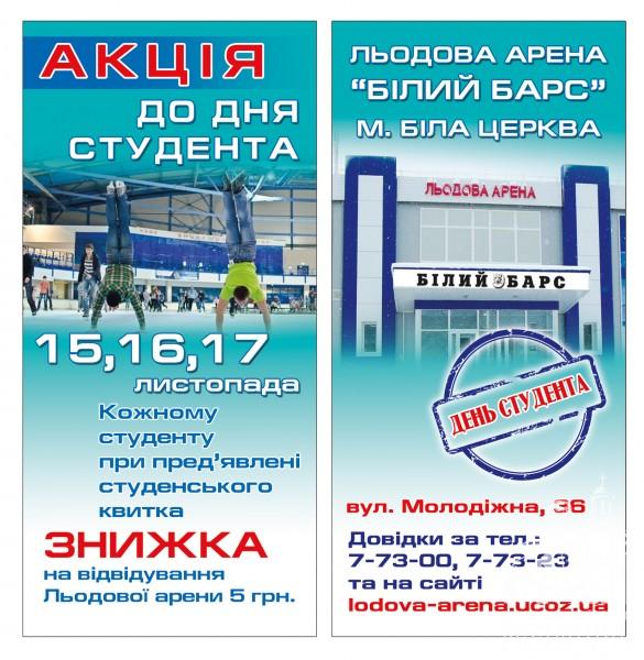 Акція до Дня студента на Льодовій арені «Білий Барс»! 15, 16, 17 листопада кожному студенту при пред’явленні студентського квитка знижка на відвідування Льодової арени 5 грн.