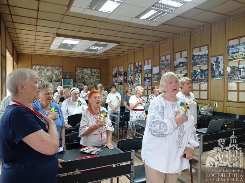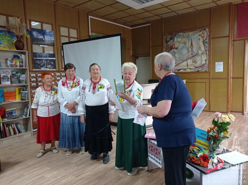 Ще з порогу книгозбірні лунала музика. До своїх красивих вишиванок пенсіонерки чіпляли патріотичні букетики, які виготовила Любов Іщенко та її помічниці. Як згодом розповіла пані Любов, жовто-блакитне серце символізує наш прапор, а на ньому квітують соняшник, волошка і рута. Посеред зали на журнальному столику красувалася квітково-патріотична композиція із соняхів, горобини, чорнобривців, троянд та …кабачка! Він наче булава розмістився посеред квіткових орнаментів. А виростила його керівниця клубу Лариса Ястребова.
